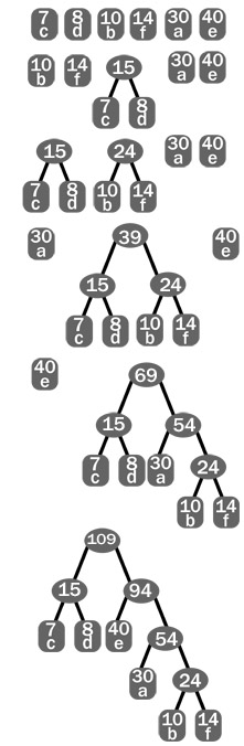 نخست هر حرف را به همراه دفعات تكرار آن(بسامد) در متن به عنوان ريشه يك درخت با تنها يك گره در نظر بگيريد.در ابتداي كار يك جنگل خواهيم داشت.از آن پس در هر مرحله دو درخت را كه بسامد ريشه آنها كمترين باشد در هم ادغام مي كنيم و درخت جديدي مي سازيم كه بسامد ريشه آن مجموع بسامد ريشه دو زير درخت تشكيل دهنده اش مي باشد.و زير درختي كه بسامد ريشه آن كمتر است در سمت چپ و زير درختي كه بسامد ريشه آن بيشتر است در سمت راست گره جديد ريشه واقع ميشود اين كار را تا جايي ادامه مي دهيم كه يك زير درخت واحد داشته باشيم.:لبخندساده:
